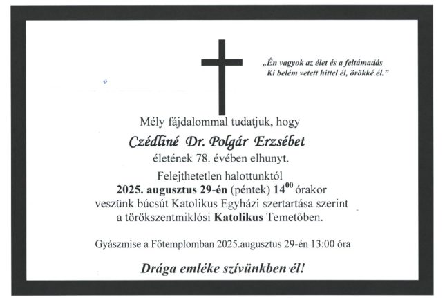 Szomorúan értesültünk korábbi Jász-Nagykun-Szolnok megyei tisztifőgyógyszerészünk (hivatali ideje kb. 1991-2006), Czédliné Dr. Polgár Erzsébet (1947-2025) haláláról. A 2000-es évek elején, Nyíredy elnök úr inspirálására ő szervezte újjá a megyei MGYT Szervezetünket; két ciklusban látta el az elnöki teendőket. Hálás szívvel emlékezünk rá.