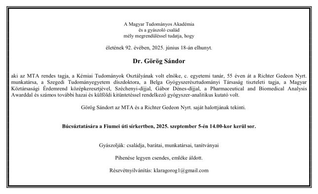 Tegnapelőtt, 2025. június 18-án, életének 92. évében, elhunyt Görög Sándor Széchenyi-díjas kémikus, gyógyszerkutató, a Magyar Tudományos Akadémia rendes tagja, Társaságunk nagyrabecsült szenátora. Görög Sándor a gyógyszeranalitika, ezen belül a szteroidok kémiájának és analitikájának nemzetközileg elismert kutatója volt. Görög Sándor 1933-ban született Szombathelyen. Érettségi után a Szegedi Tudományegyetemen folytatta tanulmányait, ahol 1957-ben szerzett vegyészmérnöki diplomát. 1957 …