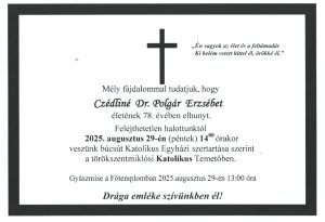 Szomorúan értesültünk korábbi Jász-Nagykun-Szolnok megyei tisztifőgyógyszerészünk (hivatali ideje kb. 1991-2006), Czédliné Dr. Polgár Erzsébet (1947-2025) haláláról.