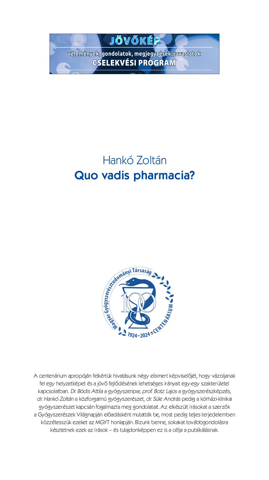 A centenárium apropóján felkértük hivatásunk négy elismert képviselőjét, hogy vázoljanak fel egy helyzetképet és a jövő fejlődésének lehetséges irányait egy-egy szakterületel kapcsolatban. Dr. Bódis Attila a gyógyszeripar, prof. Botz Lajos a gyógyszerészképzés, dr. Hankó Zoltán a közforgalmú gyógyszerészet, dr. Süle András pedig a kórházi-klinikai gyógyszerészet kapcsán fogalmazta meg gondolatait. Az elkészült írásokat a szerzők a Gyógyszerészek Világnapján előadásként mutatták be, most pedig teljes terjedelemben közzétesszük ezeket az MGYT honlapján. Bízunk benne, sokakat továbbgondolásra késztetnek ezek az írások – és tulajdonképpen ez is a célja a publikálásnak.